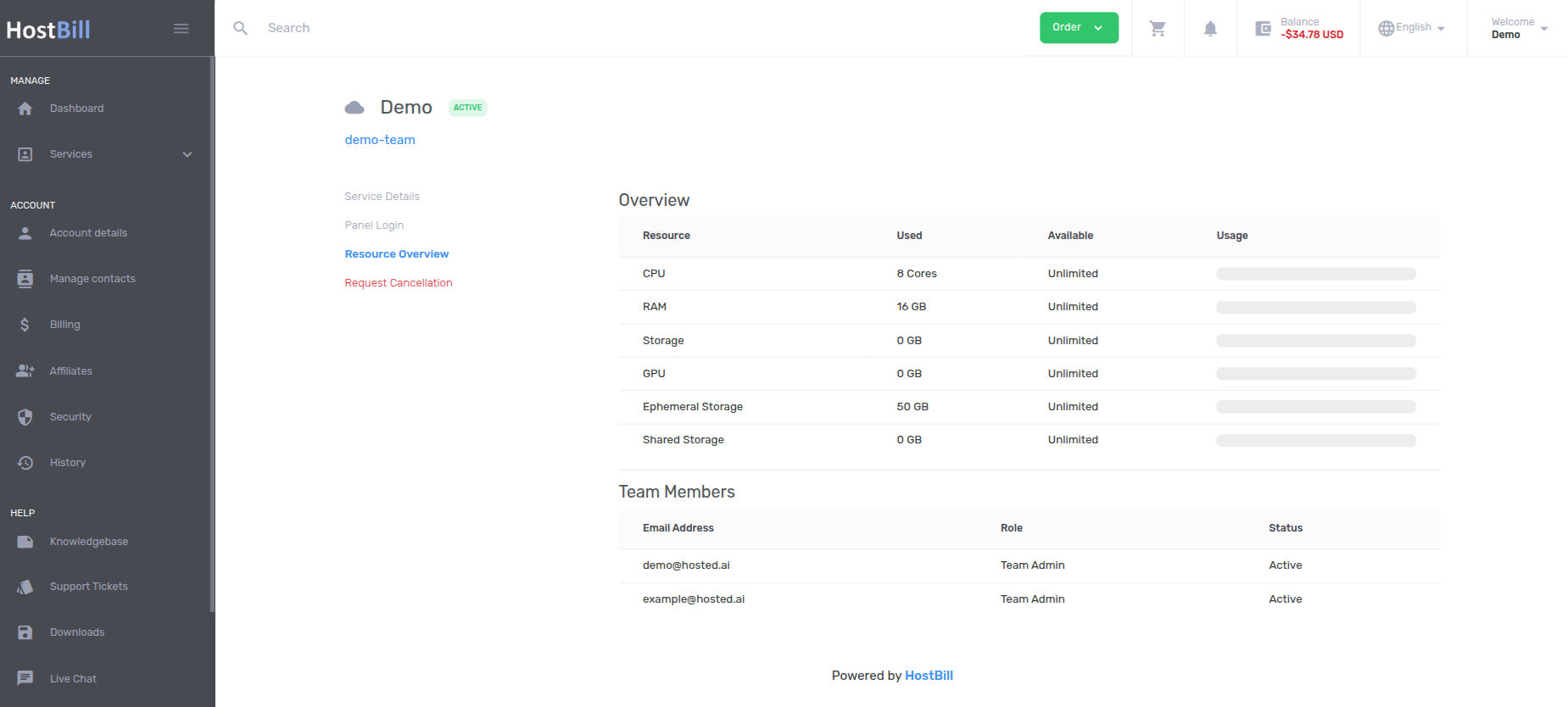 The Hosted.ai Integration Module for HostBill allows service providers to fully integrate Hosted.ai with HostBill in order to sell and manage GPU-as-a-Service offerings in a seamless, automated way. The module enables accurate, usage-based billing by automatically fetching consumption data from Hosted.ai and converting it into invoices within HostBill. Billing can be calculated based on multiple resource dimensions, including GPU, vRAM, RAM, CPU, TFlops, shared storage, and the number of running instances, making it suitable for both pay-as-you-go and flexible pricing models. Beyond billing, the module delivers deep automation for account provisioning and lifecycle management. When a service is ordered, HostBill can automatically create a team in Hosted.ai and assign the appropriate pricing, resource, image, service, and instance policies. Ongoing service control is handled directly from HostBill, allowing administrators to suspend, unsuspend, or terminate teams without manual intervention, ensuring consistent policy enforcement and reduced operational effort. On the client side, the integration enhances the HostBill Client Portal by displaying real-time resource usage, giving customers clear visibility into their consumption and costs. Users can also access the Hosted.ai Enhance platform through single sign-on with one-click login from HostBill, providing a smooth and unified user experience. For administrators, the module offers centralized control over billing details and account lifecycle management from the HostBill admin area. Usage, invoicing, and service status can all be viewed and managed in one place, enabling providers to efficiently operate, scale, and monetize their Hosted.ai-powered GPU infrastructure.